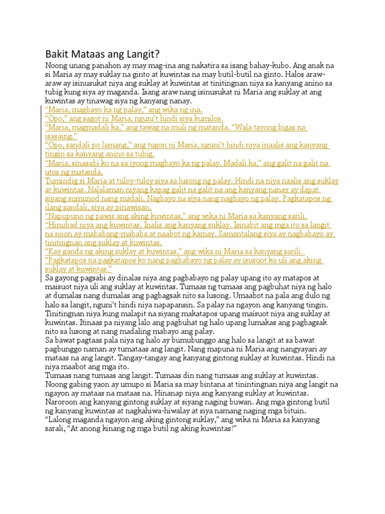 Bakit kaya tumaas ang. Nang mapuna ni Maria ang nangyayari ay mataas na ang langit. Si Maria at ang kanyang nanay ay nakatira sa isang bahay-kubo.