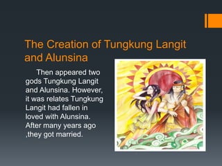 The Creation of Tungkung Langit and Alunsina Then appeared two gods Tungkung Langit and Alunsina. In a word there was only confusion. He assumed responsibility for.