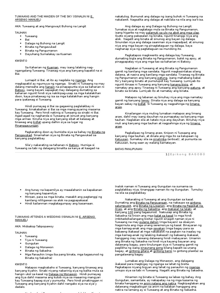 Para sa iyo sino ang kinakatawan ng dalawang pangunahing tauhan sa akdang binasa sa kasalukuyang panahon. Tuwaang is a legendary warrior hero of sky forced to flee her home in the skyworld to escape the evil giant To take the argument at face value seems to clear up the confusion. Patay ka na po.